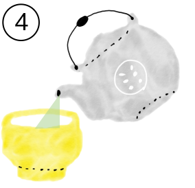 あたためておいた茶碗に回し注ぎ、急須を軽く上下に振って最後の一滴まで注ぐ